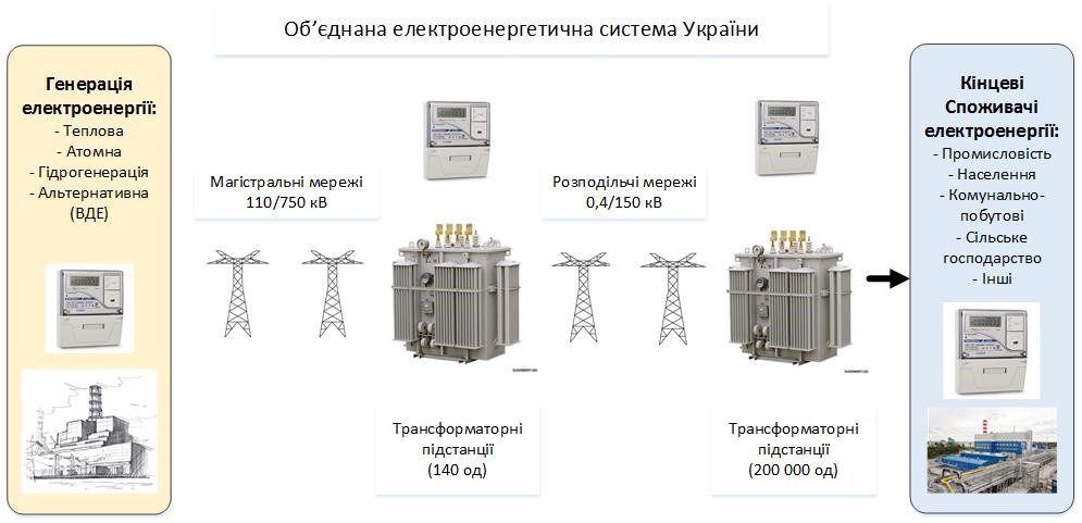 Електрогенеруючі компанії, що виробляють електроенергію, передають її операторам магістральних мереж, що транспортують цю електроенергію на великі відстані. Далі, електроенергія передається операторам розподільчих мереж, які, за участю електропостачальних компаній, та різноманітних трейдерів, доводять її до кінцевих споживачів, що розташовані на всій території України.
